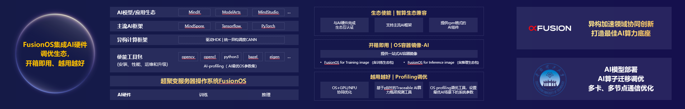 华南理工打造的异构计算平台并行加速解决方案,与超聚变在异构加速领域和AI领域进行深度探索与实践,实现了协同软硬创新、加速算力释放。此外,华南理工团队对openEuler操作系统进行了自动化部署、迁移研究和实践,与openEuler开源社区深度联动,积极参与欧拉社区建设,深度推动了openEuler系统的实际应用和AI生态的发展。