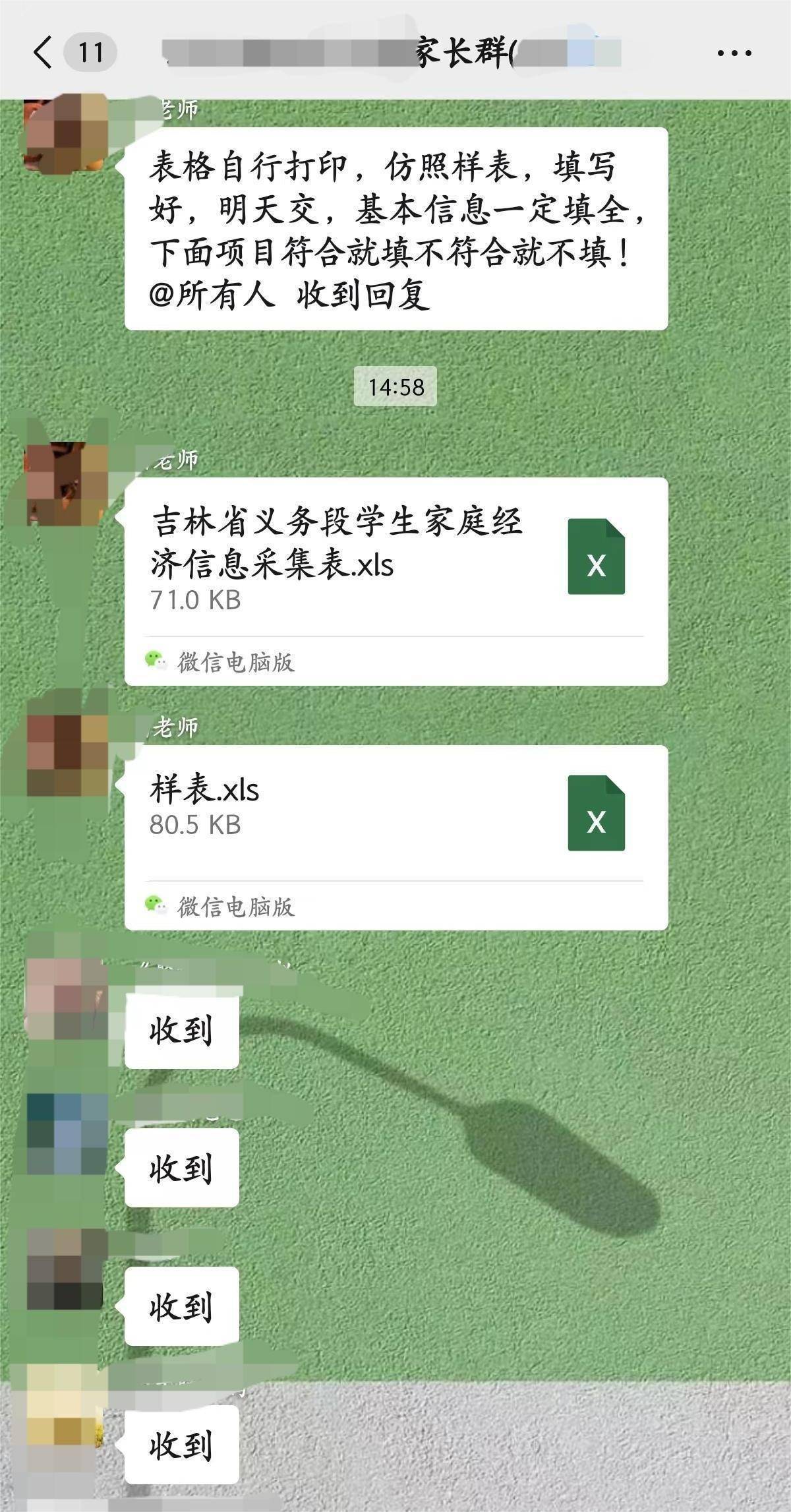 视频显示,家长群里,有昵称为某某老师的人发送消息称,“表格自行打印,仿照样表,填写好,明天交,基本信息一定填全,下面项目符合就填不符合就不填”,并且提醒了所有人,要求收到回复。随后,该“老师”发送了吉林省义务段学生家庭经济信息采集表以及样表。
