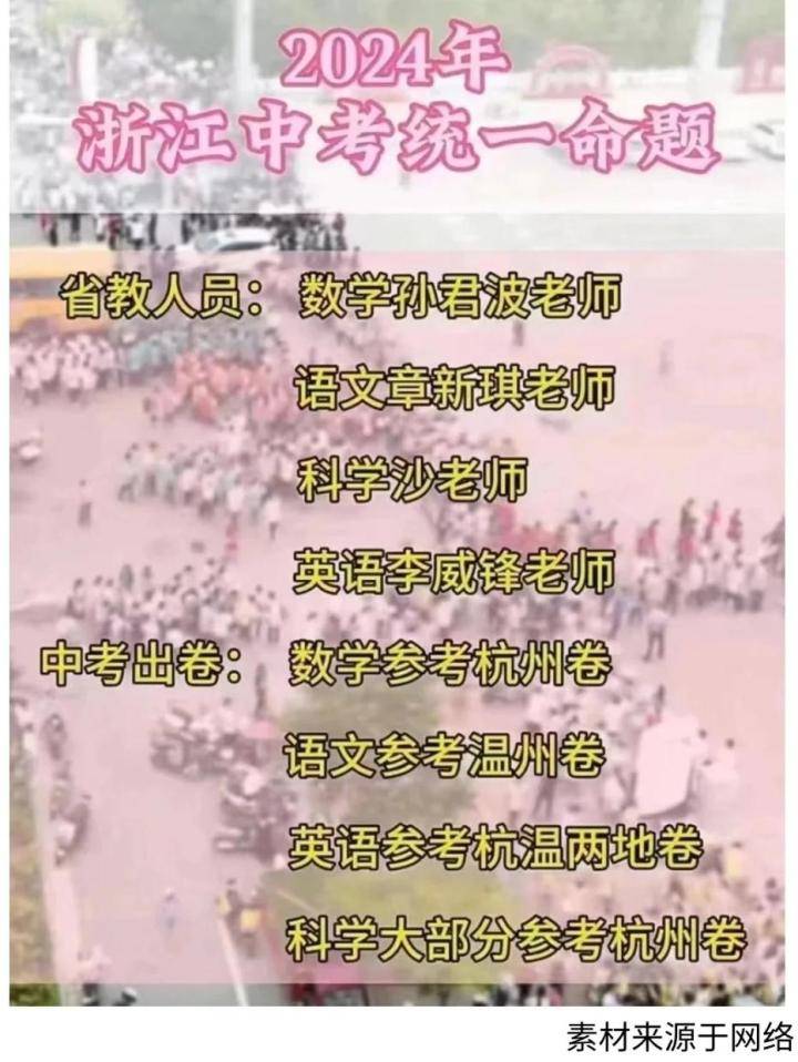 根据网上这份截图,2024年浙江中考统一命题省教人员,涉及到语文、数学、科学、英语等学科。