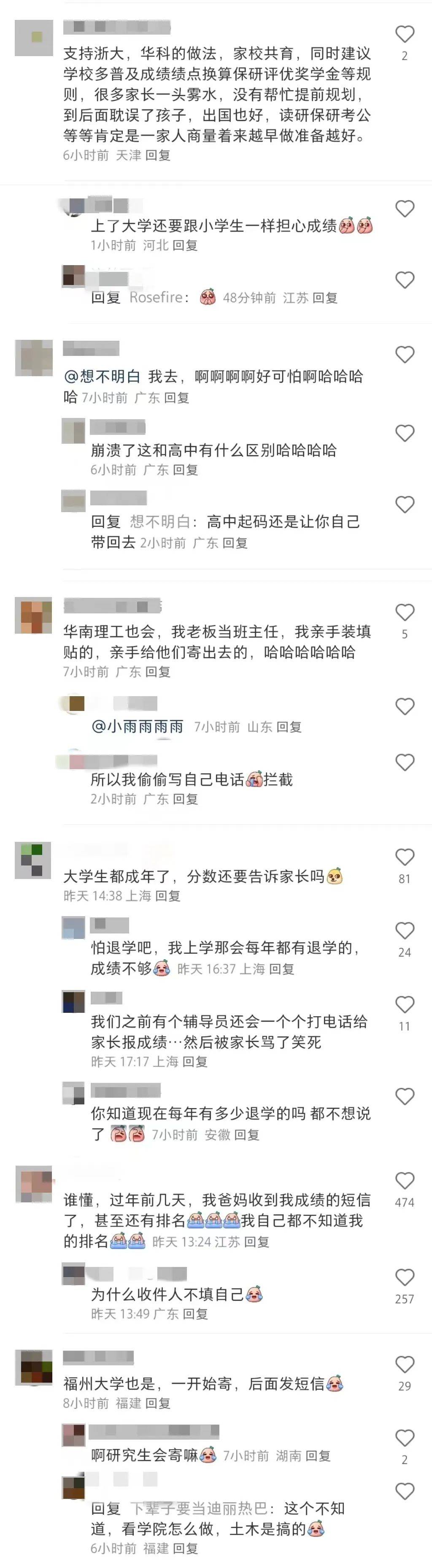 有网友很支持这一做法:“支持浙大,华科的做法,家校共育,同时建议学校多普及成绩绩点换算保研评优奖学金等规则,很多家长一头雾水,没有帮忙提前规划,到后面耽误了孩子,出国也好,读研保研考公等等,肯定是一家人商量着来,越早做准备越好。”