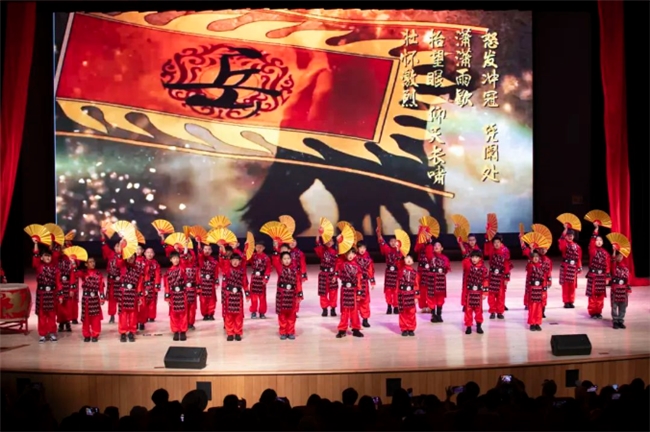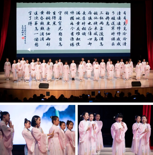 听完了唐诗,再来听听与之并称为双绝的宋词!宋词合乐而歌,能聆听到细腻柔美、含蓄清丽的婉约词,也能感受到意境雄浑,充满豪情壮志的豪放词。四年级的同学们为大家演绎了婉约含蓄的《声声慢》,和气壮山河、传诵千古的《满江红》。