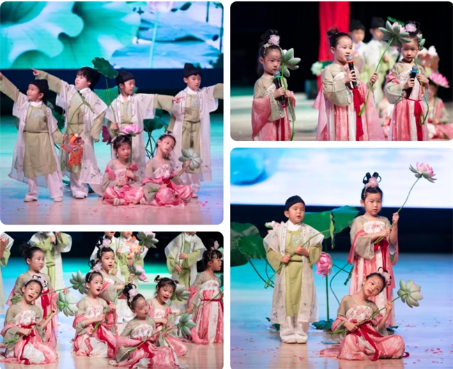 五彩斑斓的灯光闪烁,犹如星星点点洒落在舞台上,为这场盛大的演出增添了几分神秘和梦幻。孩子的舞台表演配合精致的装造、流光溢彩的舞美设计,把对诗词的理解和对历史的尊敬展现的淋漓尽致,又各具特色,令人耳目一新。有太多太多精彩的瞬间和场景,将台下观演的老师们和家长们带入了情境,欣喜、甚至感动落泪。