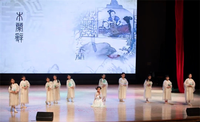 直至今日,木兰替父从军的故事依旧家喻户晓,代代相传。戎马关山报国志,魂牵梦绕女儿情,一身戎装透出一股勃发的英雄气。我们看到的是英姿飒爽的少年将军,世代向人们传达着她的勇敢与坚韧。三年级的同学精彩演绎了木兰出战前后两种截然不同的心境,舞剑更是节目中最大的亮点。