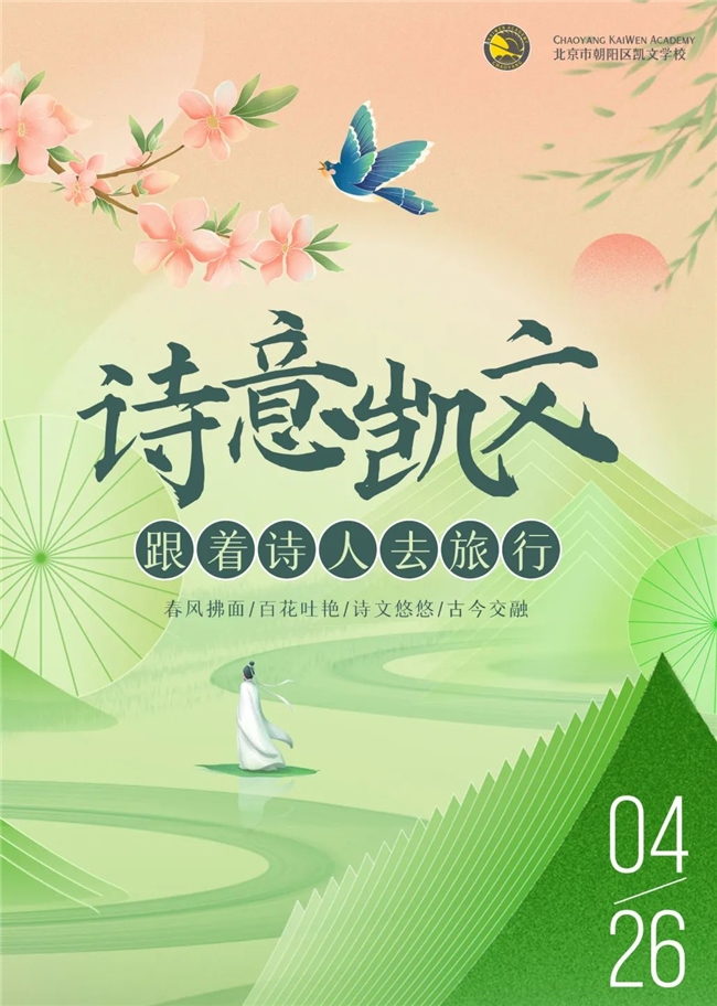 4月26日,在朝阳凯文“中文文化周系列主题活动”中,小学部的师生们准备了一场视听感受俱佳的诗意盛宴,声势浩大、不同寻常,家长们也受邀前来观演,每个班级都精心编排了与诗词有关的节目,带领大家展开了一次跟随诗人心灵远行的奇妙之旅。