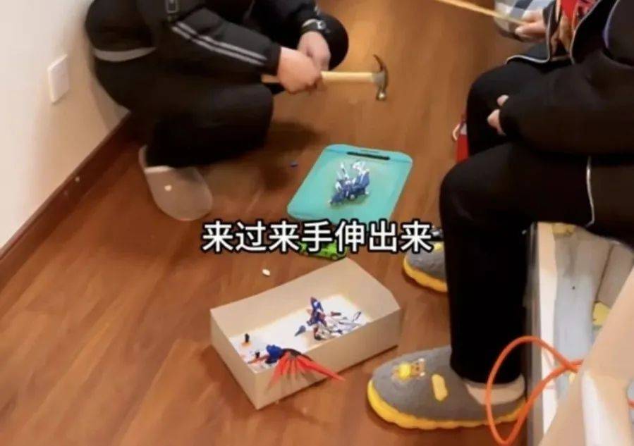 紧接着,她手持戒尺,先是打了男生的手心,随后让家长拿来锤子,强迫男生亲手把手办砸碎,并大声训斥: