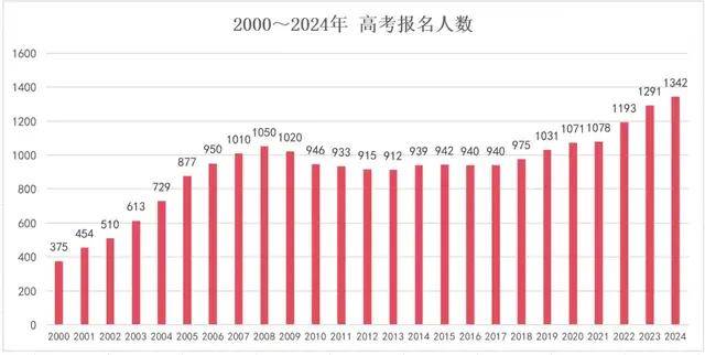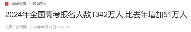根据央视网信息,2024年全国高考报名人数1342万人,比去年增加51万人。