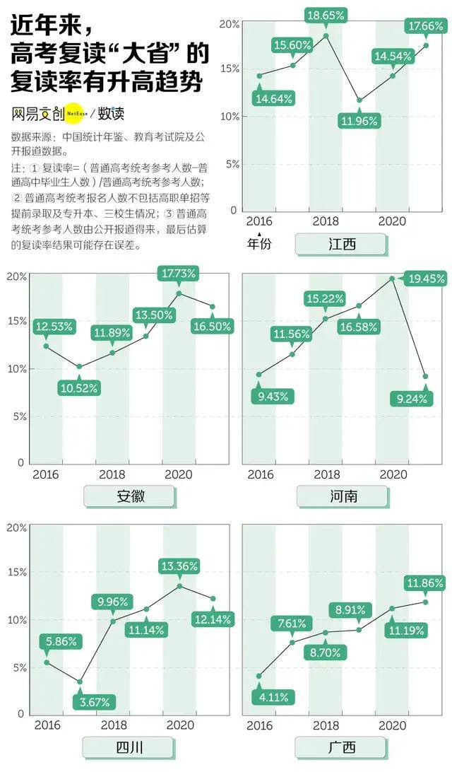 根据网易数读,2021年复读生中,江西、安徽、四川、广西、陕西五省,复读率都超过了10%,河南排名第六。