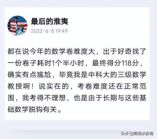 2022年,新高考I卷数学高考题流出后,一位自称是中科大三级数学教授耗时90分钟答题,最后也只拿了118分。