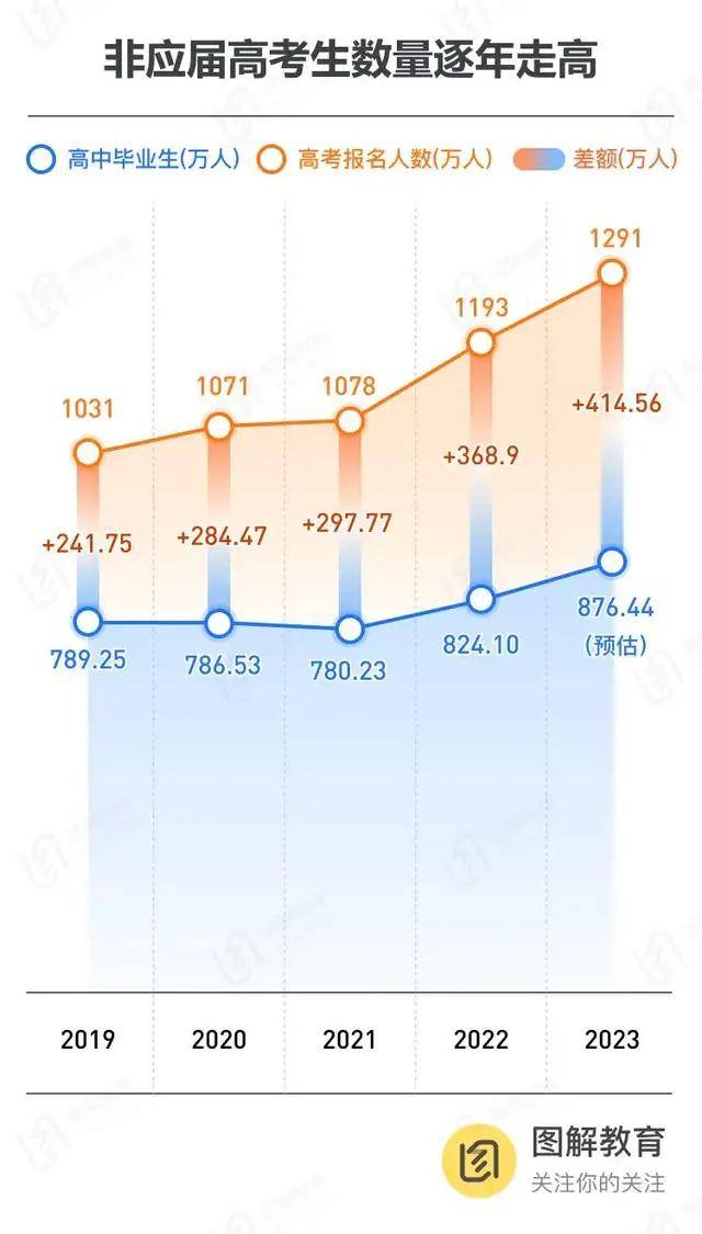 2019年,非应届高考生数量为241.75万人,而后逐年攀升至284.47、297.77、368.9、414.56万人。