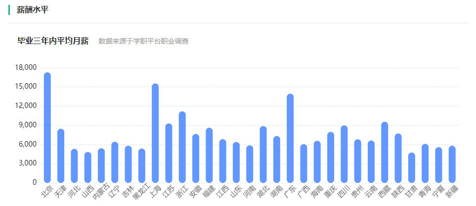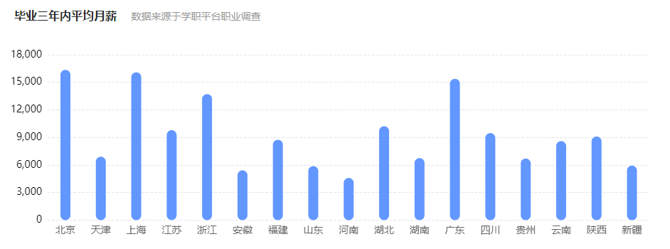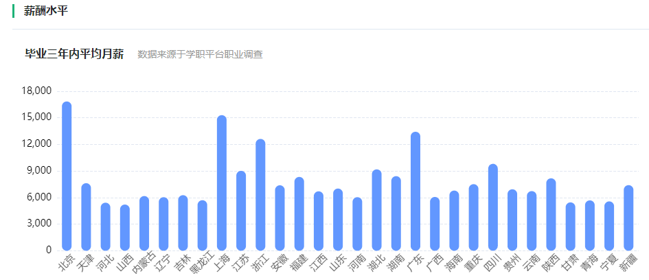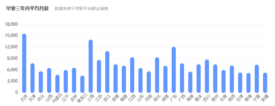 计算机科学与技术专业本科生毕业三年内平均月薪超过1.2万的地区仅有北京、上海、广东三地。月薪达到9千的有江苏、浙江、西藏、四川。