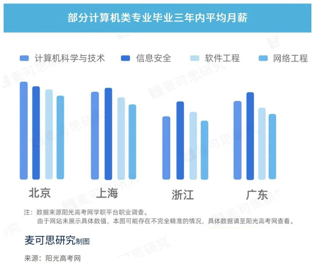 在北京工作的计算机科学与技术专业本科生,毕业三年内的平均月薪最高。上海、浙江、广东三地,均是信息安全专业的月收入最高。网络工程专业毕业生在四地的月收入,均不及其他3个计算机热门专业。