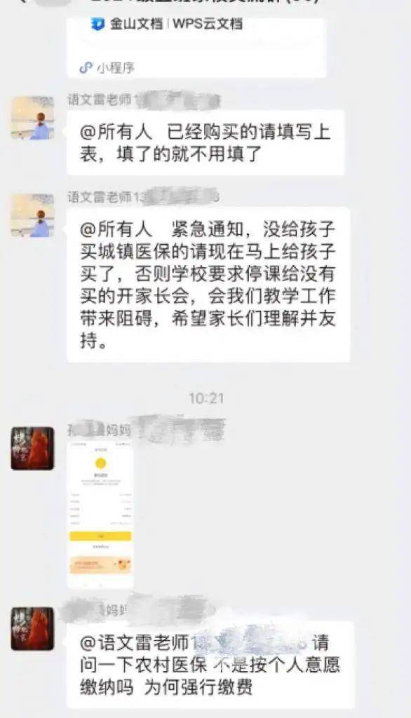前述家校交流群里,这位学生家长曾反问语文老师,“请问一下,农村医保不是按个人意愿缴纳吗?为何强行缴费?”