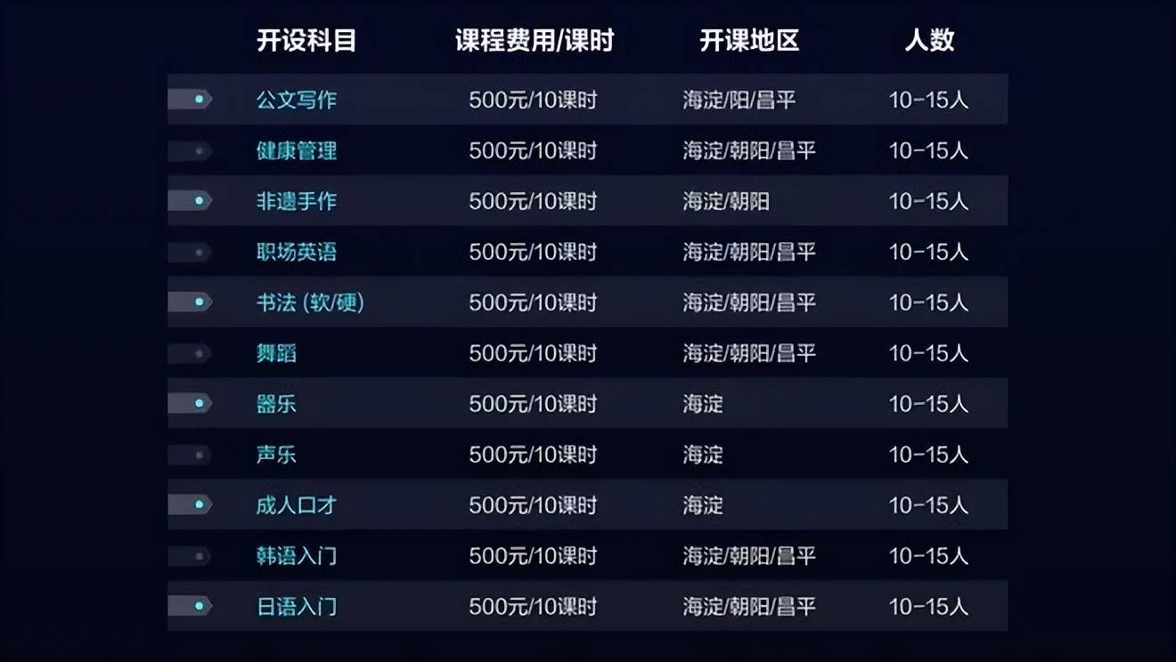 其旗下子品牌中公优职更正式推出“夜校课堂”,已推出课程涵盖职场写作、实用外语、音乐素养、健康管理、美妆造型、舞蹈、游泳、非遗手作、书法、绘画等29门课程,每节课时控制在1小时左右。目前主要教学点主要在北京朝阳、海淀和昌平等地区的教学基地。