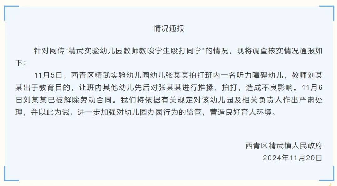 11月20日,西青区精武镇人民政府就该事件发布情况通报称,涉事教师已被解除劳动合同。