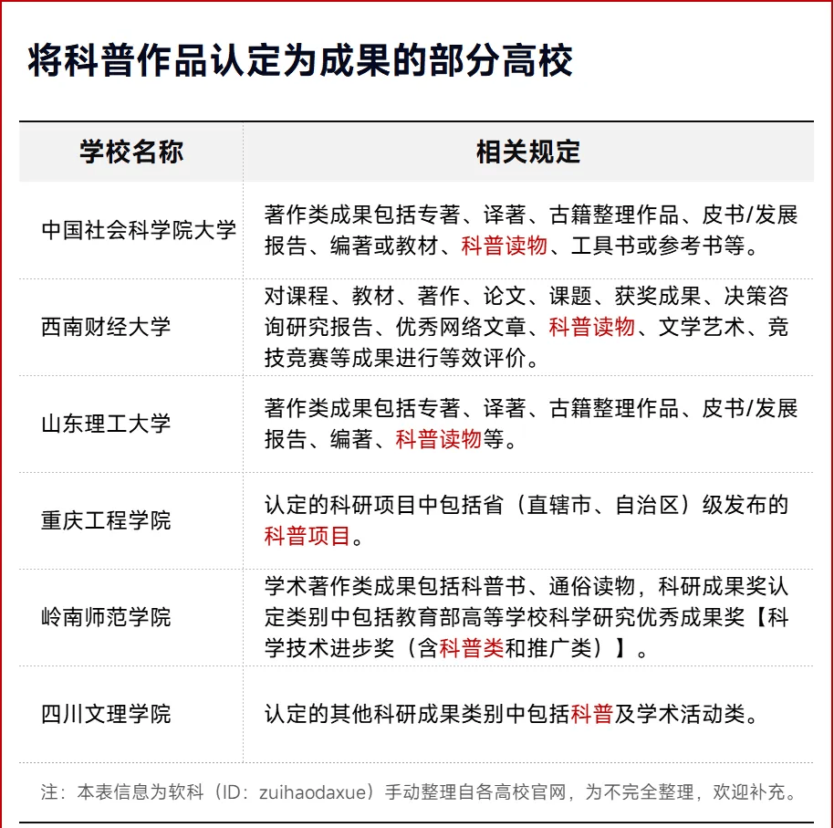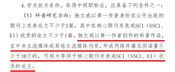 你能想象吗?一则在主流媒体刊发的10w+科普作品=1篇核心期刊的独立一作。《中国科协自然科学研究系列科普专业职称评审标准(试行)》这份文件中正是这样规定的。
