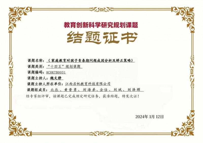为了帮家长打破这一困境,专业靠谱的家庭教育机构启帆教育早在 2023 年便主动申报 “十四五”规划教育科研课题,聚焦《家庭教育对孩子青春期问题成因分析及矫正策略》这一核心主题,开启了长达一年的深度研究,为家长寻找 “破局钥匙”。