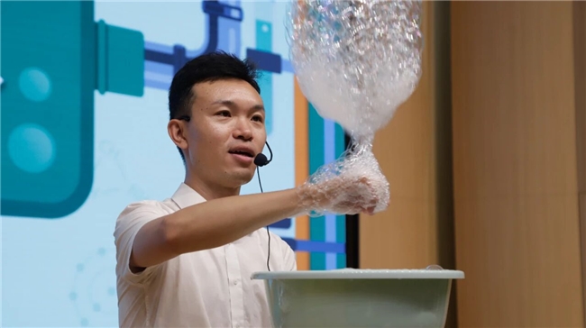 在培训环节,浙江省科技专家库成员、儿童多元成长规划研究院专家组成员胡建建老师围绕“科学教学中的策略及教学方法解析”展开专题讲座,帮助教师理解如何设计更具启发性和探究性的科学课堂。在科学活动实践展示中,呈现了“火焰掌”“脉冲炮”等多项趣味性强、参与度高的教学案例,将抽象的科学原理转化为操作简便、视觉效果丰富的小实验。
