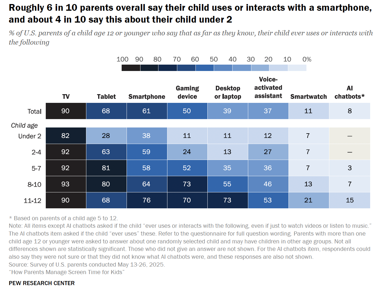 摘要: 10月9日消息,皮尤研究中心对美国家长进行的一项调查揭示了科技在12岁及以下儿童中的普及程度,以及家长管理屏幕时间的日常现实。约10%的父母表示,