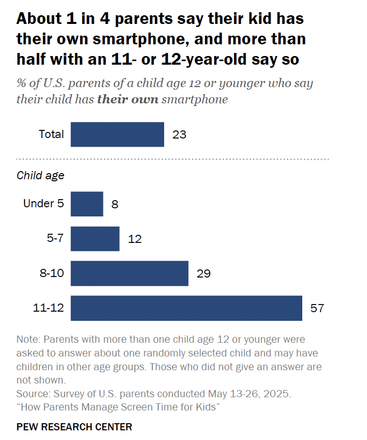 大约六成11岁或12岁孩子的父母表示,他们的孩子拥有自己的智能手机;相比之下,8至10岁孩子的父母中,这一比例为29%,而对于更小的孩子,这一比例约为十分之一。