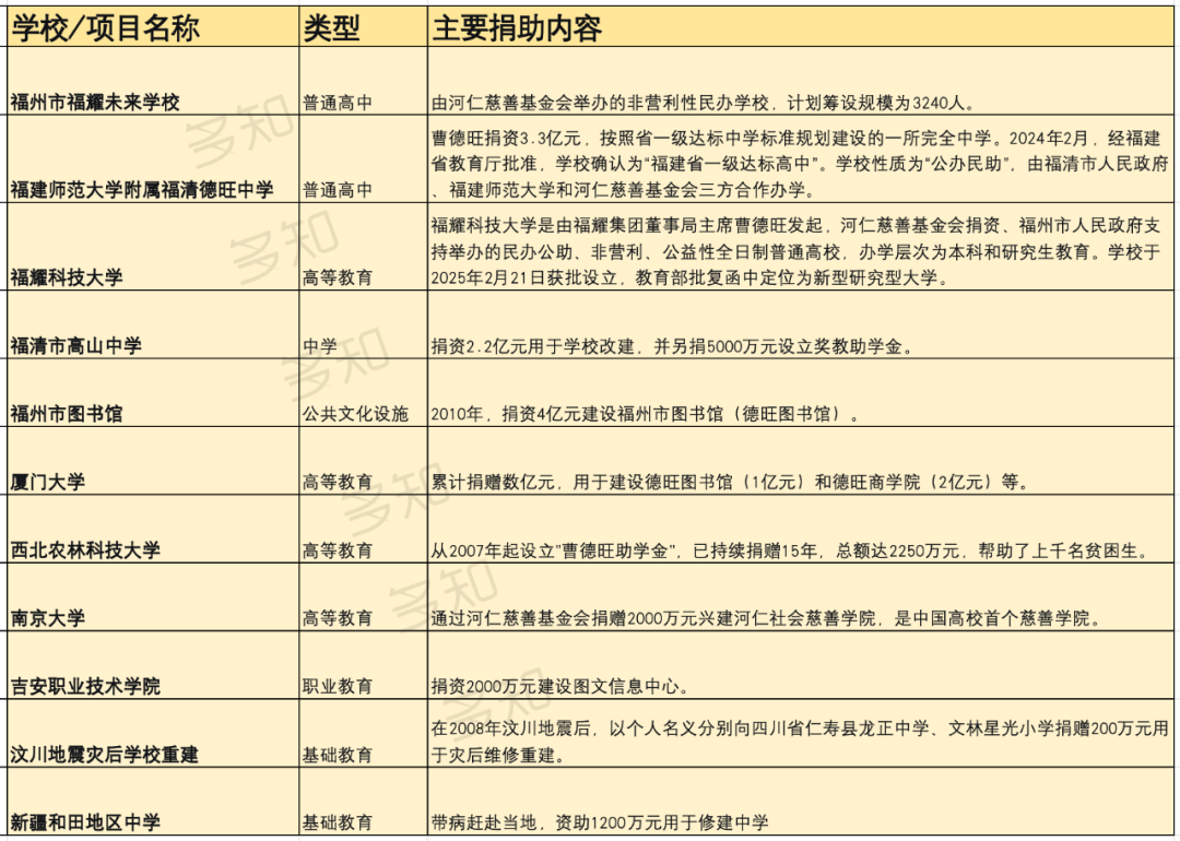 (曹德旺在教育领域的投入和捐助,不完全统计)