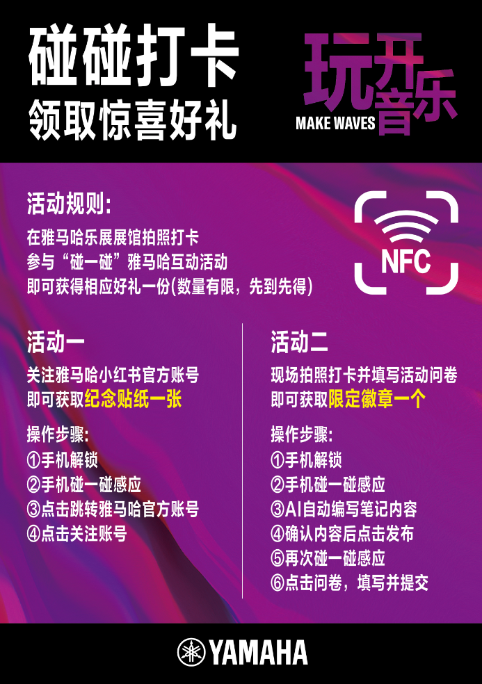 关注雅马哈管弦打公众号,并现场打卡《吹响吧!上低音号》拍照,加话题发布至社交媒体,领取雅马哈管弦打定制徽章!