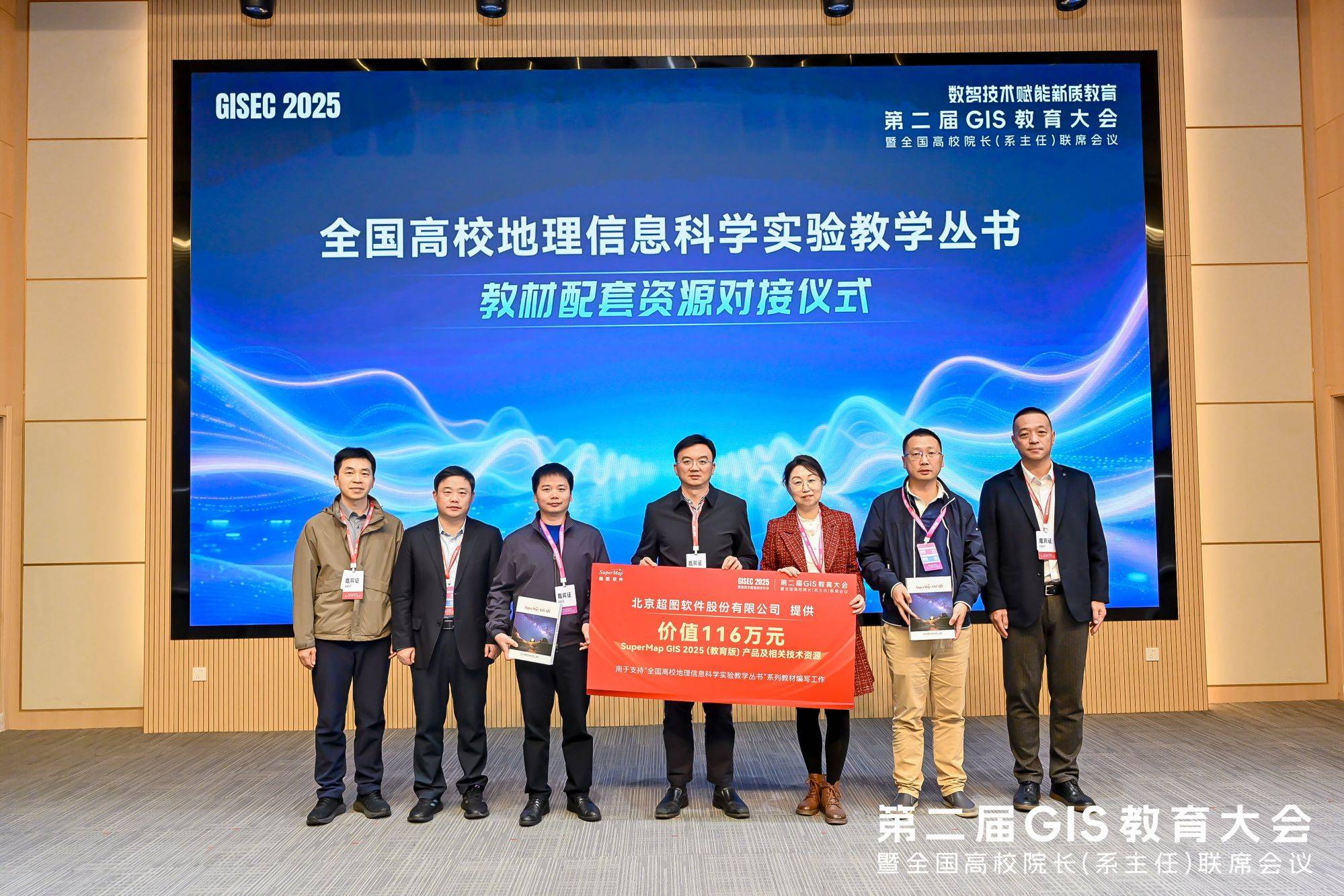 大会举行了“全国高校地理信息科学实验教学丛书”教材编委聘任暨配套资源对接仪式。超图软件将提供“SuperMap GIS 2025”教育版软件产品及相关技术资源用于支持“全国高校地理信息科学实验教学丛书”系列教材编写工作。会上,超图软件副总裁兼华中、华南大区总裁孙鹏,超图软件总工程师兼平台产品线总裁胡中南代表超图软件,向教材编委会主任中国地理信息产业协会教育工委会主任委员、南京师范大学张书亮教授,教材主编南京师范大学熊礼阳教授,华中师范大学吴浩教授,陕西师范大学李晶教授,云南师范大学洪亮教授提供软件产品。