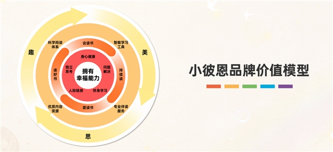 第四层(品牌支撑):科学阅读体系、优质内容资源、智能学习工具、专业伴读服务。 这是小彼恩为扫除家庭阅读障碍,提供的四位一体完整解决方案。