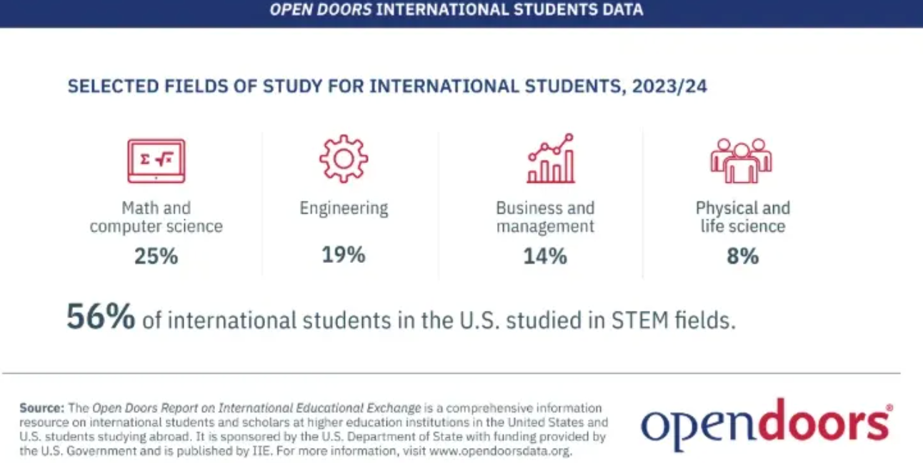 在所有学术层次中,超过半数(56%)的国际学生在2024-2025学年选择了STEM(科学、技术、工程和数学)专业,这反映出美国对科学、技术、工程和数学教育的持续需求。总体而言,国际学生占2024-2025学年美国高等教育学生总数(19,247,640人)的6.1%。