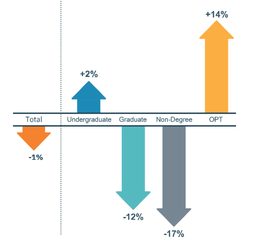 2025年秋季的快照数据显示,这种模式仍在继续。各高校报告称,本科生人数增加了 2%,实习生人数增加了 14%,研究生人数减少了 12%。而因研究生层次多年强劲增长,OPT人数持续上升14%。