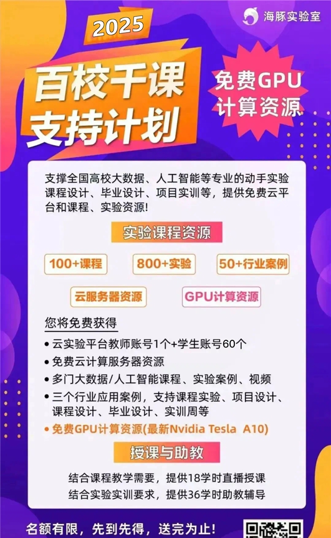 与此同时,杭州睿数科技(海豚实验室)同步推出了“百校千课免费支持”计划,全力为推进全国高校大数据与人工智能教学发展贡献力量,欢迎老师们致电咨询。