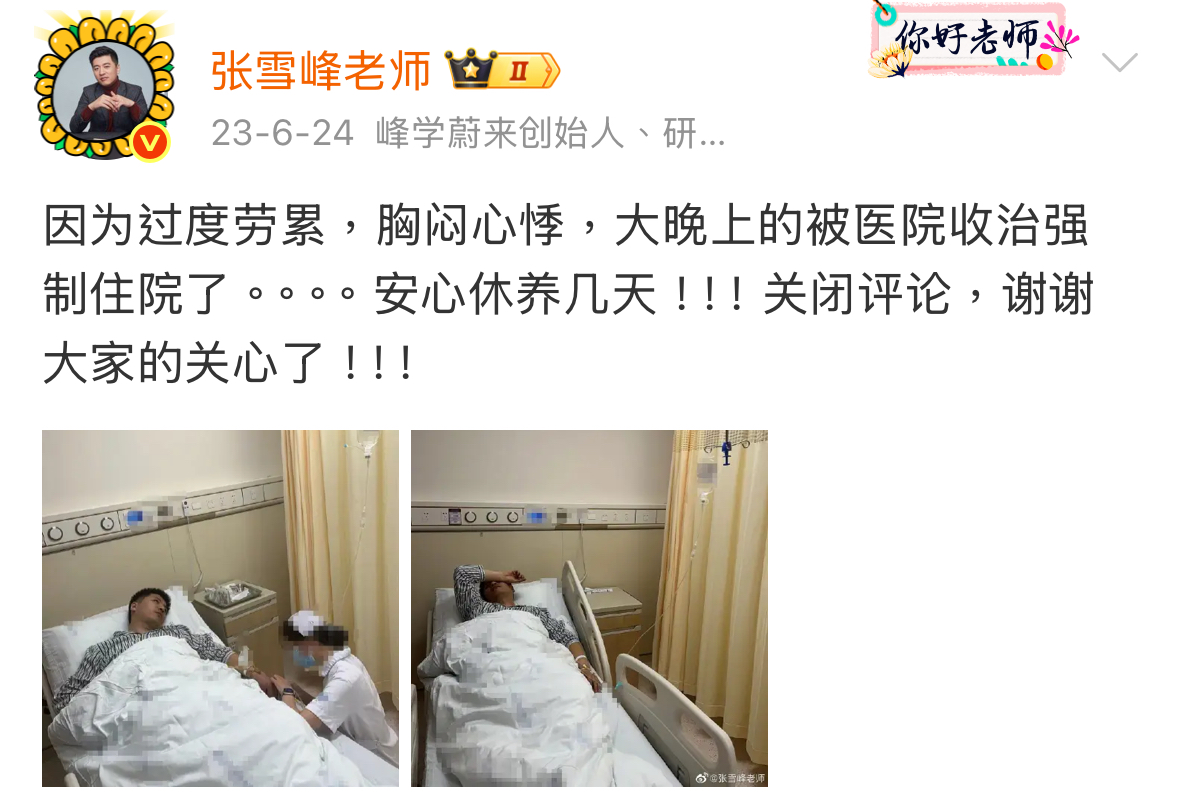 在这一年的夏天,张雪峰曾因为“过度劳累,胸闷心悸”被医院收治强制住院。