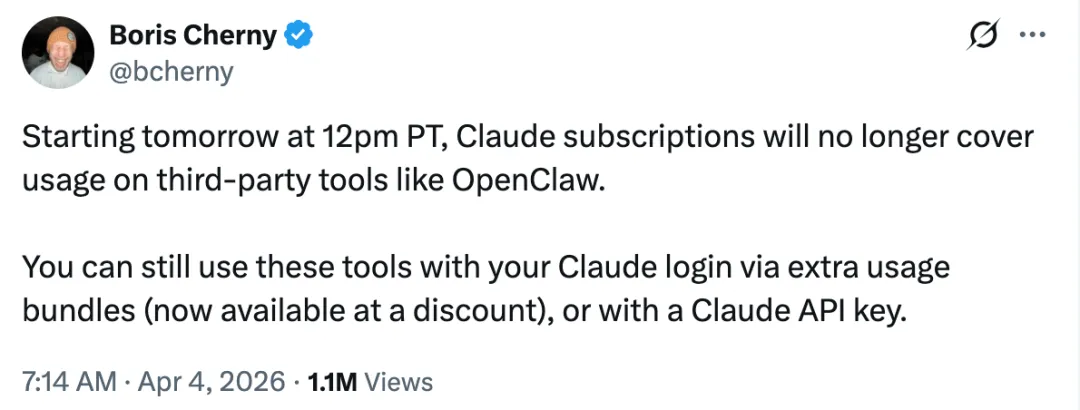 4月4日消息,Anthropic公司Claude Code项目的开发负责人Boris Cherny在社交平台宣布:从太平洋时间中午 12 点(对应北京时间4月5日凌晨3点)开始,Claude 订阅将不再涵盖 OpenClaw 等第三方工具的使用。您仍然可以通过购买额外的使用套餐(现已推出折扣)或使用 Claude API 密钥,使用您的 Claude 帐户登录并使用这些工具。