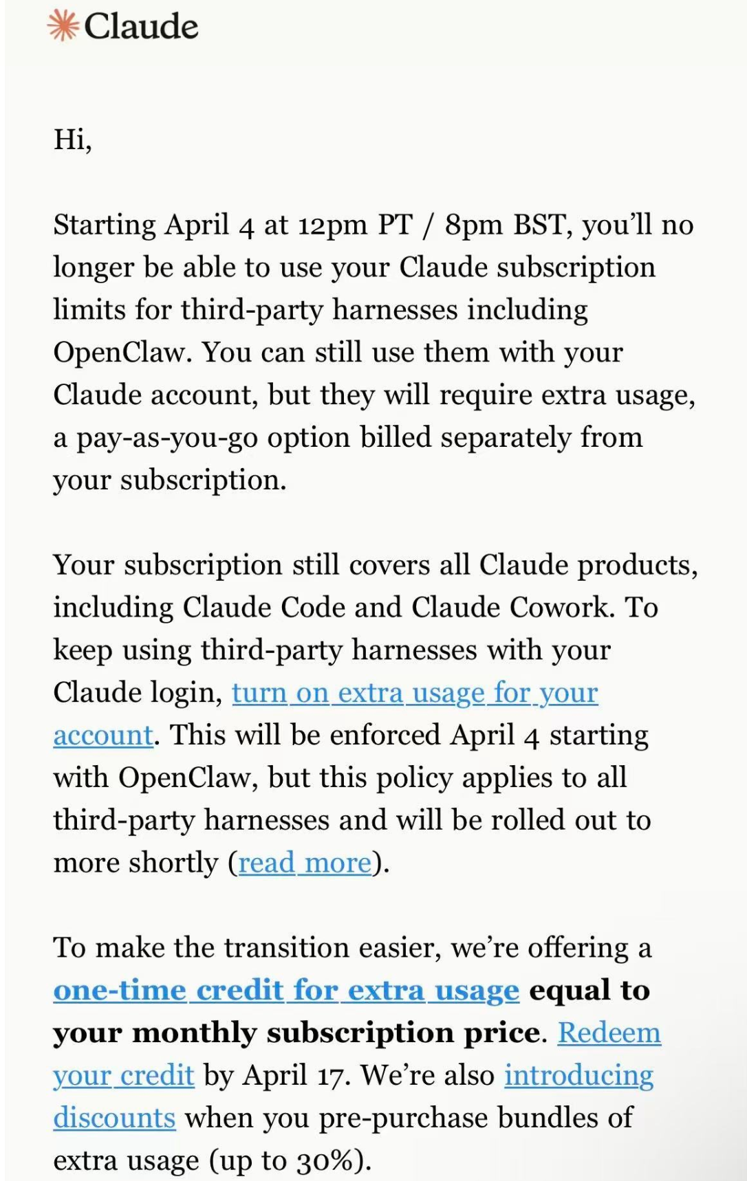 同时,Anthropic也给用户发了一封邮件提到,用户的订阅仍然覆盖所有 Claude 产品,包括 Claude Code 和 Claude Cowork。要继续使用你的 Claude 账户登录第三方工具,请为你的账户开启“额外使用量”功能。该政策将于 4 月 4 日从 OpenClaw 开始执行,但此政策适用于所有第三方工具,并将在短期内推广到更多工具。
