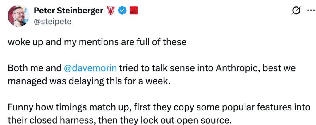 OpenClaw开发者Peter Steinberger提到,曾试图劝说Anthropic,但最终只争取到延期一周执行。他说:“真是讽刺,他们先是把一些热门功能复制到他们的封闭框架里,然后又把开源拒之门外。”