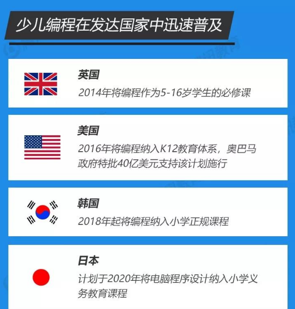 据不完全统计,欧盟中15个国家课程中增加编程教育,其中12个国家在高中设立编程课程,9个国家在小学便开始设立编程课程。