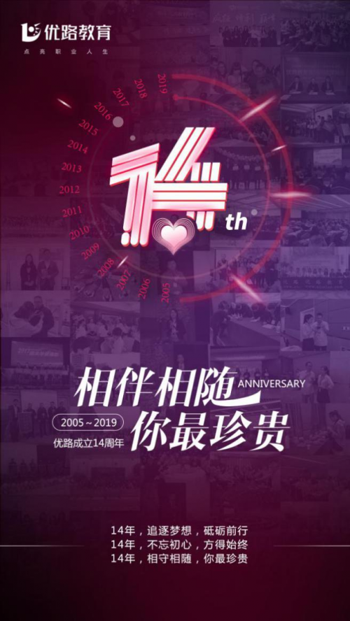 从2005到2019,优路教育团队人数从最初的个位数增长到现在的5000余人,专职教研由几个人壮大到如今的600余人。感谢越来越多的人加入优路,感谢优路团队和家人的信任、支持,感谢付出,感谢包容,感谢一路相守相随。