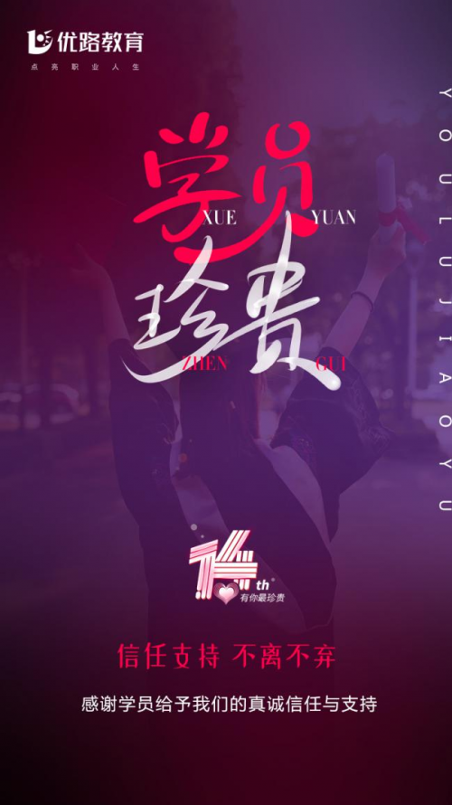 优路教育自创立来,一直秉持“以人为本”的教育理念,坚持用教育传递知识的温暖和力量。在这种理念的支撑和引导下,服务好每一个学员,成为了优路人最根本的义务。近年来,优路学员每年呈十几万甚至几十万的增长,有力印证了这种服务理念的正确性和有效性。庞大的学员基数,就是学员对优路信任的最好证明,也是优路人肩上最重的责任。初识有缘的,感谢选择优路;相伴走过一段旅程的,感谢支持优路;一直携手前行的,感谢信任优路。“相守相随 你最珍贵”——金杯银杯不如学员的口碑,学员的认可和信赖是优路最宝贵的财富,也是优路坚守初心砥砺前行的力量之源。
