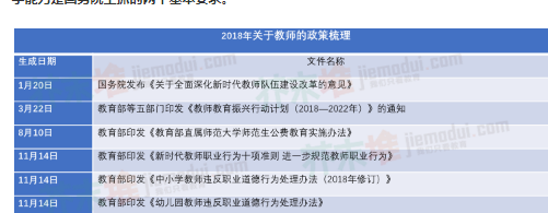 对于中小学教师自身而言,师德师风、课堂教学能力是国务院主抓的两个基本要求。同时,政策一方面在极力保证教师的权益,如首次明确将制定教师优待办法,保障教师健康体检、旅游、住房、落户等权益;另一方面又在逐步提高对教师的任职要求,如严格教师资格准入制度,实行教师资格定期注册制度。