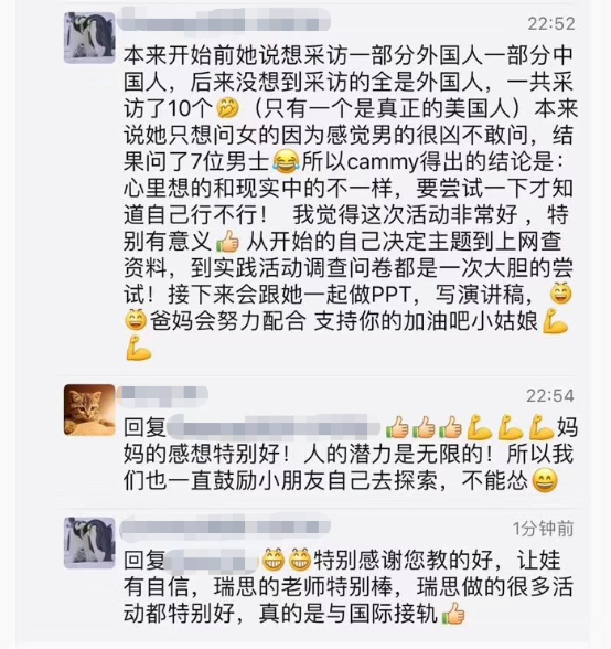 每一年的瑞思英语项目实践活动,都是瑞思英语倾力为孩子们打造的检验展示英语水平和自我锻炼的舞台。上海瑞思家长们也对活动表示认可和肯定,下面是来自学员家长的分享: