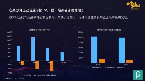 如上图所示,2018年在线教育企业独角兽和上市企业普遍亏损严重。反而,“将被颠覆”的线下教育老牌机构新东方和好未来却保持了健康的增长势头,丝毫没有被颠覆的迹象。业内人士分析称,在线教育的本质是教育而非互联网,教培企业最终的教育价值交付能力才是长期发展的关键。