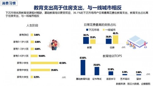 据酷云互动发布的《下沉市场研究报告》显示,下沉市场的教育意识升级非常可观,有超过三分之一的人把教育支出作为了日常最高花费。并且和一线城市截然不同的是:下沉市场在教育方面的支出甚至高出了住房支出。