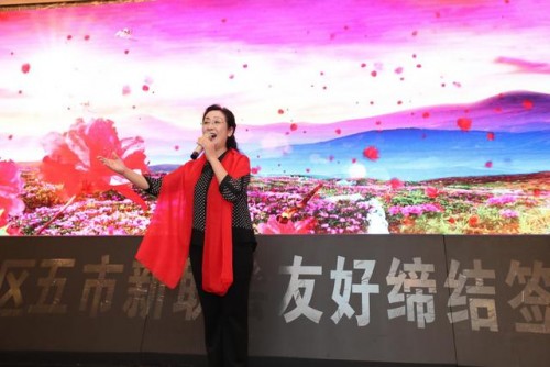 19时,辽宁省四区五市新联会友好缔结签约仪式在大连瓦房店市新联会的高峰女士的歌曲《我们的中国梦》中拉开序幕。